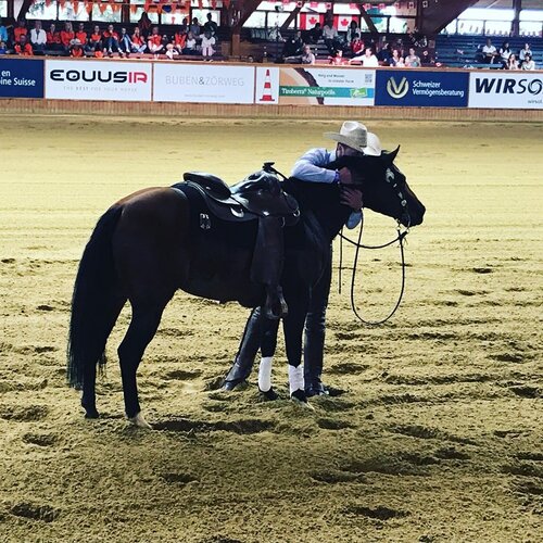 Alle sechs deutschen Reiner steigerten sich nochmals nach dem Mannschaftswettkampf. Am Ende hieß der neue Europameister Grischa Ludwig (Bitz) mit Coeurs Little Tyke. Die beiden brillierten als vorletzte Starter schon beim Run In mit vorbildlichem Aufbau des Tempos und einem langen, weichen Stop. Und so ging es weiter. Als Grischa Ludwig in den letzten Run down ging, getragen von den Rufen aus dem Publikum „Einer geht noch…“, und dann in einen atemberaubenden Stop glitt, war klar, dass das ein ganz hoher Score werden würden: 225,5. Gina Schumacher (Gland) setzte als letzte Starterin mit Shine N Whiz alles auf eine Karte, musste dann aber nach einem hervorragenden Beginn Penalties in einem Rollback hinnehmen, so dass es schließlich bei einer 219 blieb.