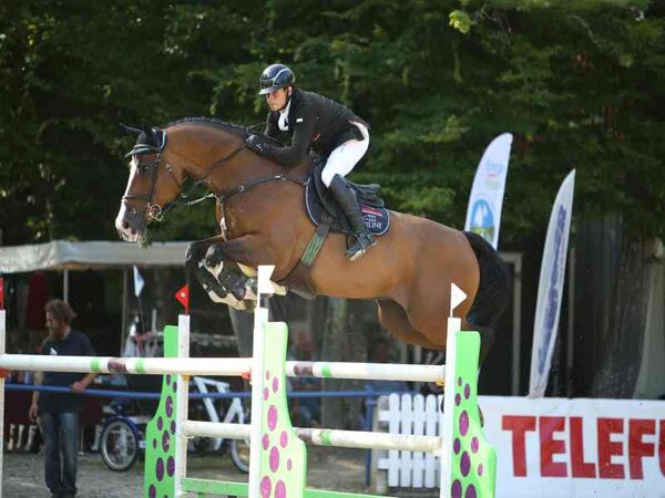 Sascha Braun aus Achern springt höher als er gucken kann: Der Springreiter aus der Ortenau siegte am Samstagabend beim Turnier in Pirmasens-Winzeln im Barrierespringen, dessen Steilsprünge im letzten Stechen auf 1.90 Meter hochgezogen waren. Sein Wallach Carigno spielte mit den Abmaßen. Das Turnier in der Pfalz ist wieder einmal ein gutes Pflaster für die Springreiter aus Baden-Württemberg. Armin Schäfer platzierte seinen Cantunaro auf dem vierten Platz in einem Zwei-Sterne-S-Springen, in dem Sönke Aldinger mit Marie Luise Siebte wurde (rok/Foto: Doris Matthaes)